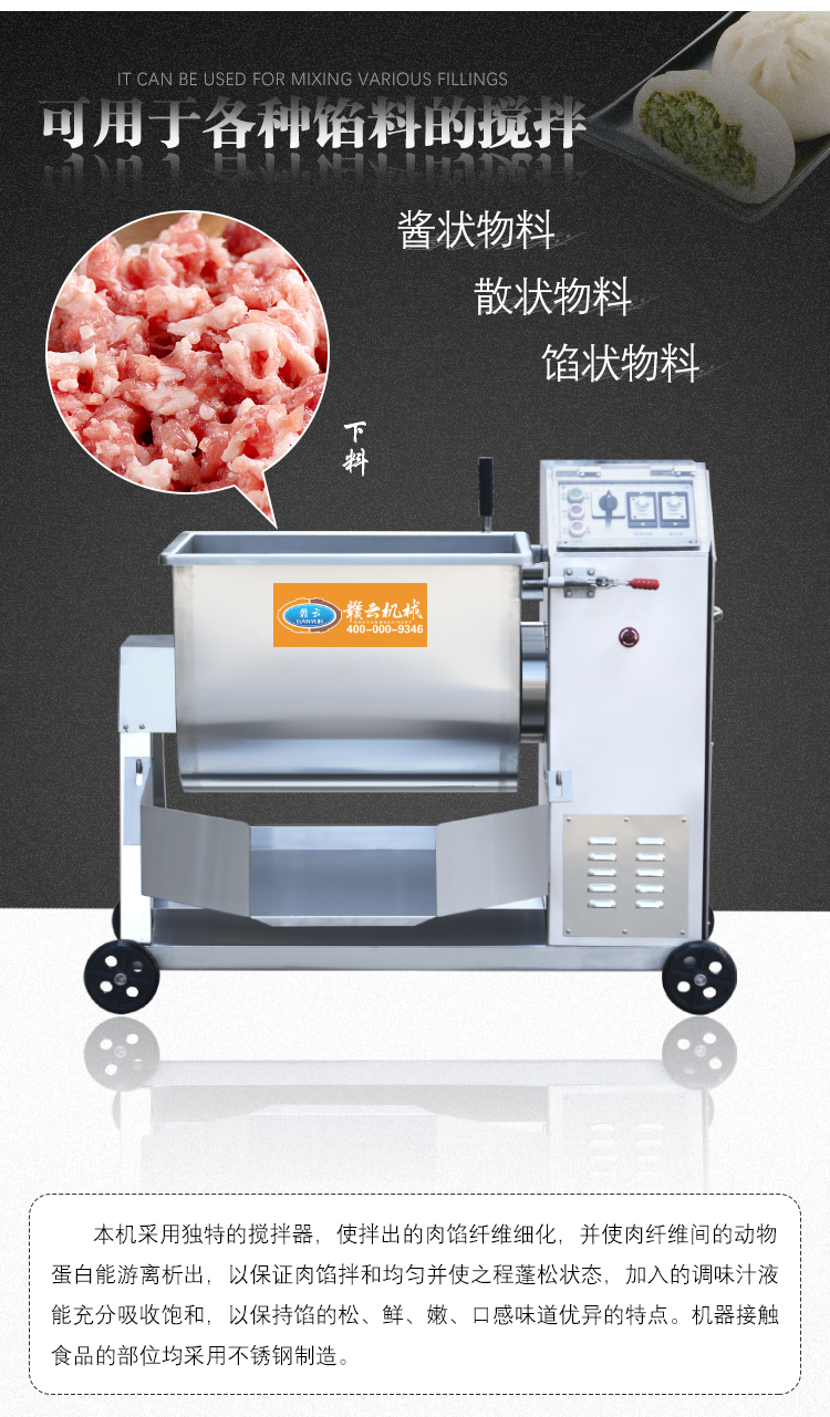 本機采用304不銹鋼材質設計,符合食品衛(wèi)生加工需求,絞龍型攪拌鋼軸可向內向外雙向攪拌旋轉運動,由倒順開關控制攪拌方向,適合粘稠度較大物料的攪拌,攪拌過程還對肉質起嫩化效果,是肉餡、肉醬、菜餡等攪拌的上好設備。